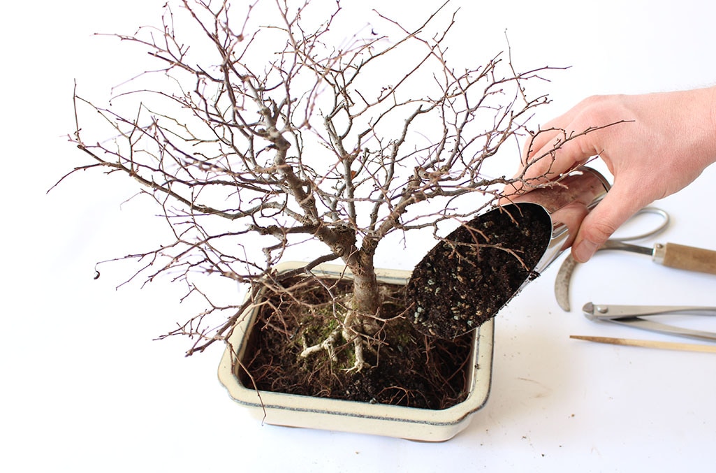 將赤玉土、鹿沼土、熔岩石以2:1:1的比例調和成適合大多數樹種的混合土壤。當您無法經常為盆栽澆水,則可以採用保水性較佳的混合土壤(可用較多赤玉土);在氣候潮濕之處,則需選擇排水性較佳的比例(可用較多熔岩石)。請至盆栽土壤一文了解更多關於混合土壤的細節。介質如果較難取得,則可用赤玉土和川砂做調和,初學者可用1:1,當您熟悉了您的盆栽後可再自行做適當的調整。